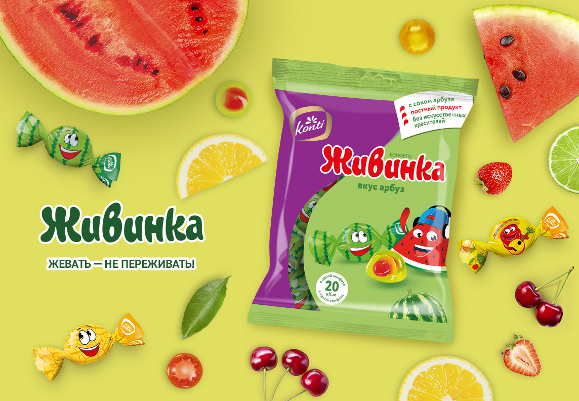 Живинка – сочные желейные конфеты с начинкой, созданные из природных компонентов, фруктовых и ягодных соков, без добавления искусственных красителей, ароматизаторов и консервантов.